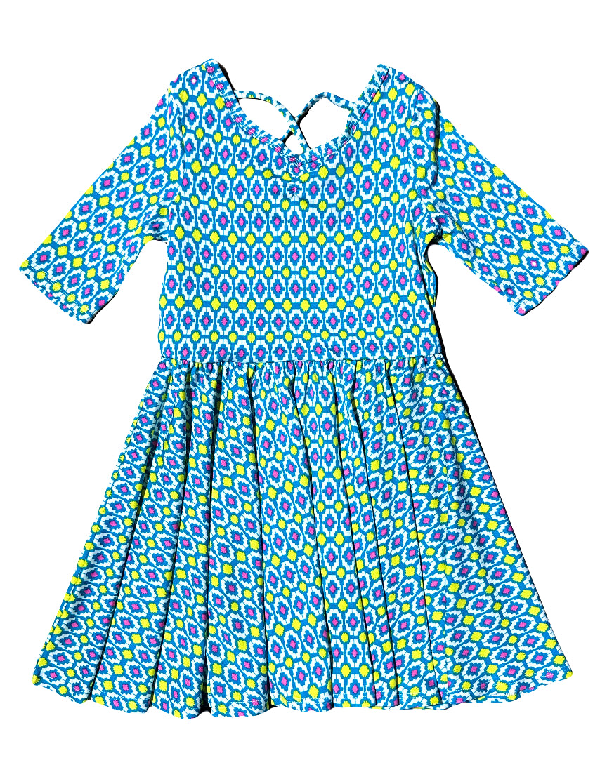 Colorful and bold, the Kaleidoscope Dreams Ballerina Dress is bursting with energy! With its dazzling geometric pattern in teal, yellow, pink, and blue, this dress is made to stand out. The ballerina crisscross back adds a graceful touch, while the twirl-ready skirt makes it perfect for playdates, parties, and dancing through every adventure.