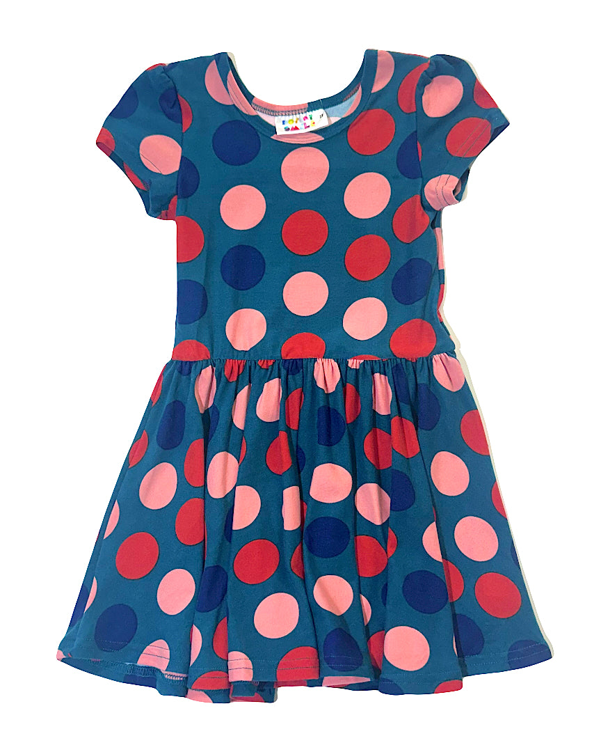 The Confetti Pop Cap Dress is a bright and playful twirly dress bursting with cheerful color. Featuring a rich teal background covered in bold polka dots in shades of berry red, blush pink, and navy, this dress has a fun confetti-inspired look girls will love.