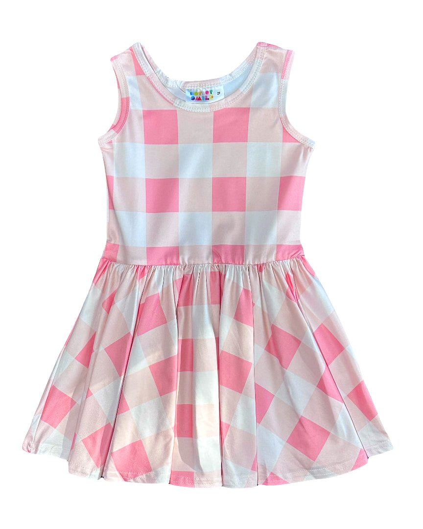 The Sweet Picnic Tank Dress is a charming twirly dress inspired by sunny days and classic picnic style. Featuring a soft pink and cream gingham check pattern, this dress creates a sweet and timeless look girls will love.
