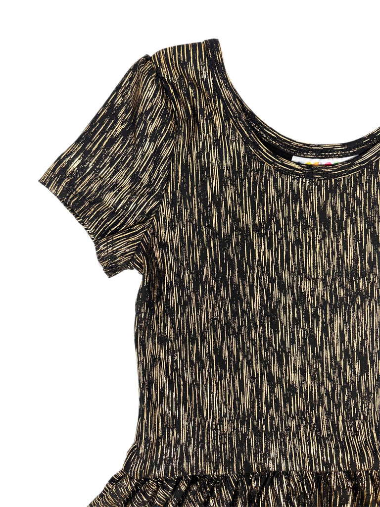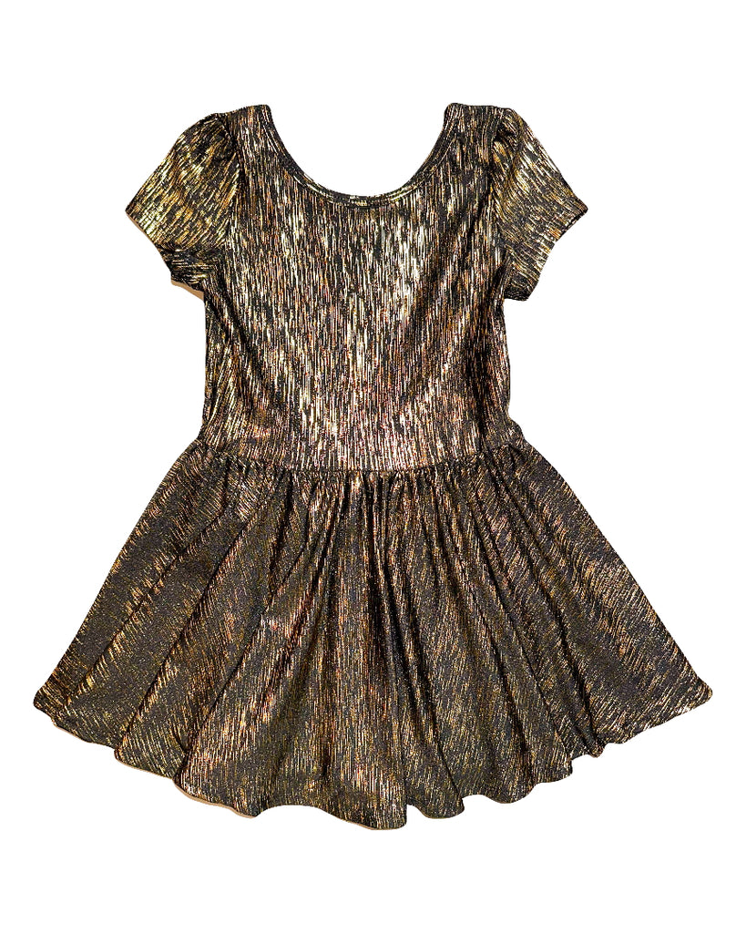 Shimmer and shine in the Golden Gatsby Fancy Dress, is the perfect outfit for little ones who love a touch of glamour! With a dazzling metallic gold and black fabric that catches the light with every twirl, this dress is made for special moments. The short sleeves, round neckline, and flared skirt create an elegant yet playful silhouette, perfect for parties, celebrations, or just feeling extra fabulous. Whether she’s dancing under the stars or making a grand entrance, this dress ensures she sparkles with every step!