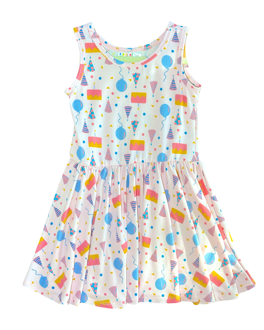 The Party Time Tank Dress is a festive and playful twirly dress made for celebrations and everyday fun. Featuring colorful balloons, party hats, and birthday cake prints scattered across a bright background, this dress brings joyful energy to every spin.