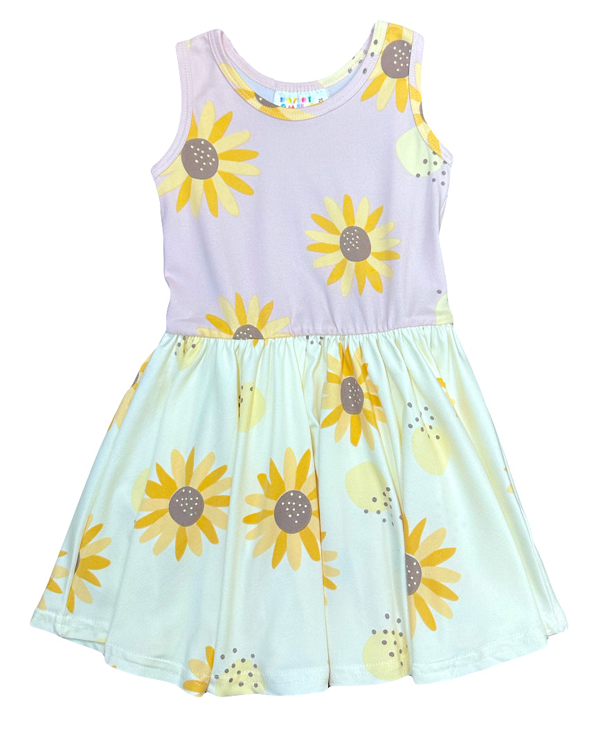 Our Pastel Sunflower Tank Twirl Dress captures the warmth of sunshine and the sweetness of springtime blooms. Featuring cheerful golden sunflowers scattered across a dreamy palette of lavender and mint, this whimsical design feels fresh, playful, and full of charm.