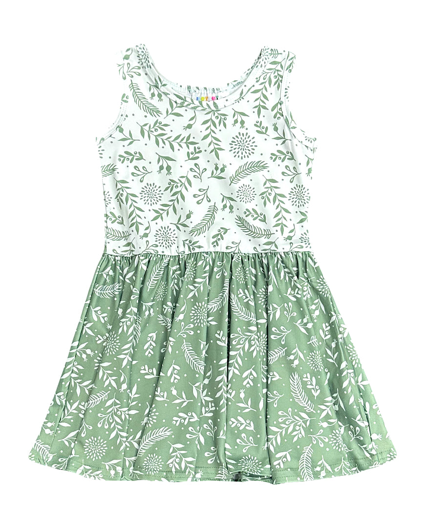 Our Sage Garden Tank Twirl Dress brings a breath of fresh air to her everyday wardrobe. Featuring a delicate white botanical print over a soft sage green backdrop, this dress feels calm, timeless, and beautifully understated.
