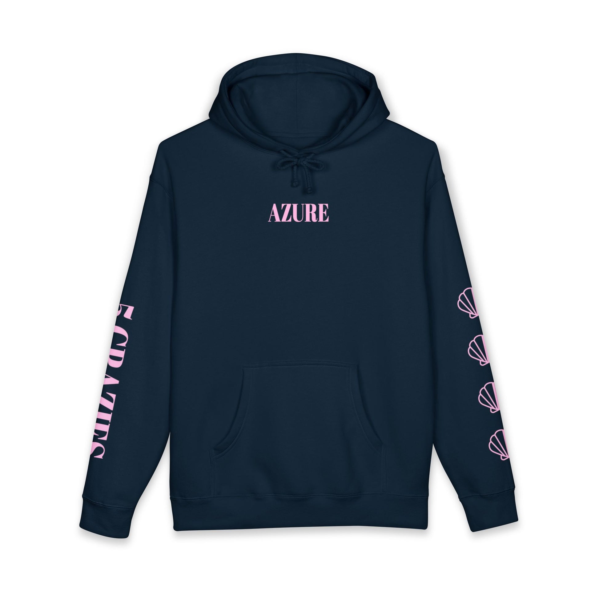This heavyweight hoodie blends coastal surf vibes with everyday warmth. Deep navy fabric anchors soft pink surf-inspired graphics: a small “AZURE” chest print, repeated seashell motifs down one sleeve, bold “SURFDATES” lettering down the other, and a floral-patterned pink surfboard on the back. The dense, fleece-lined hood and thick 10 oz fabric hold shape and trap heat on chilly mornings after dawn patrol. Loose, relaxed fit layers easily over tees. Wear it to the beach, on the drive home after a session, or while planning your next break at a cafe — it reads like a quiet, sun-warmed reminder of salt air and slow tides.