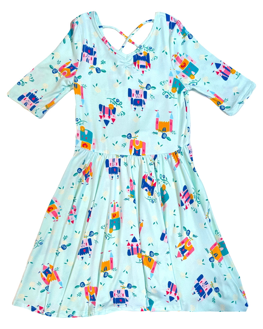 The Fairytale Castle Ballerina Dress is pure storybook magic! With colorful castles in pink, yellow, and blue set against a dreamy aqua backdrop, this dress is perfect for little royals with big imaginations. The ballerina crisscross back adds a graceful touch, while the twirl-ready skirt is made for adventures — from pretend play in enchanted kingdoms to dancing at real-life parties.