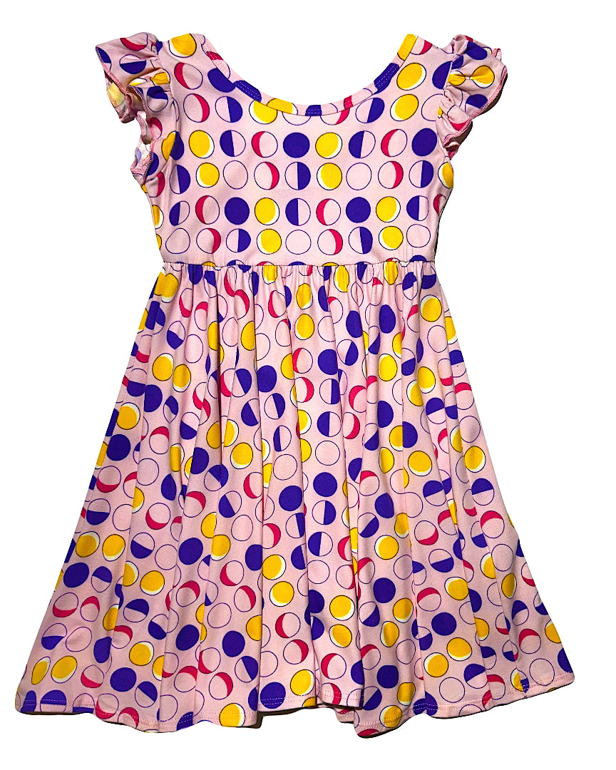A dress as dreamy as the night skyβthe Pink Colored Moon Empire Dress is a celestial-inspired masterpiece! With a soft pink base adorned with vibrant yellow, purple, and pink moon-like circles, this dress brings a cosmic twist to playful fashion!