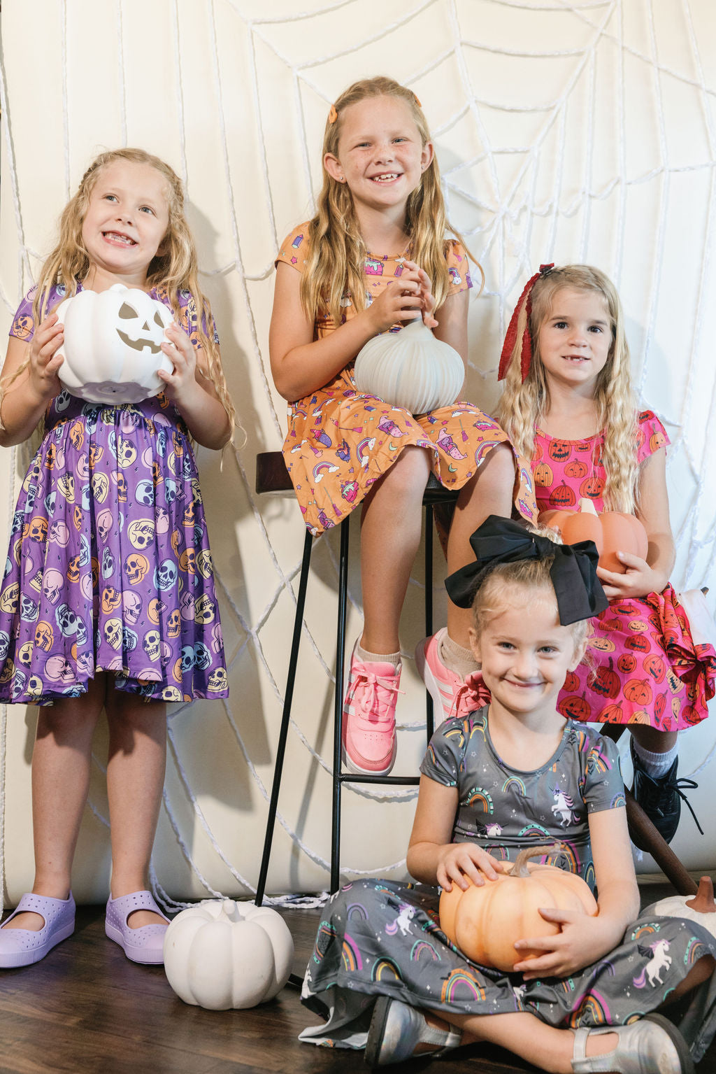 Turn up the fright and the fun this Halloween with the Frightful Fun Skulls Cap Dress πππ§‘! This vibrant purple dress is splashed with candy-colored skulls and pumpkins in bold shades of orange, pink, yellow, and blue. With its comfy cap sleeves and twirly skirt, itβs perfect for trick-or-treating, parties, or just adding a spooky-sweet flair to everyday adventures. Equal parts playful and spooky, this dress is ready for all the thrills of the season!
