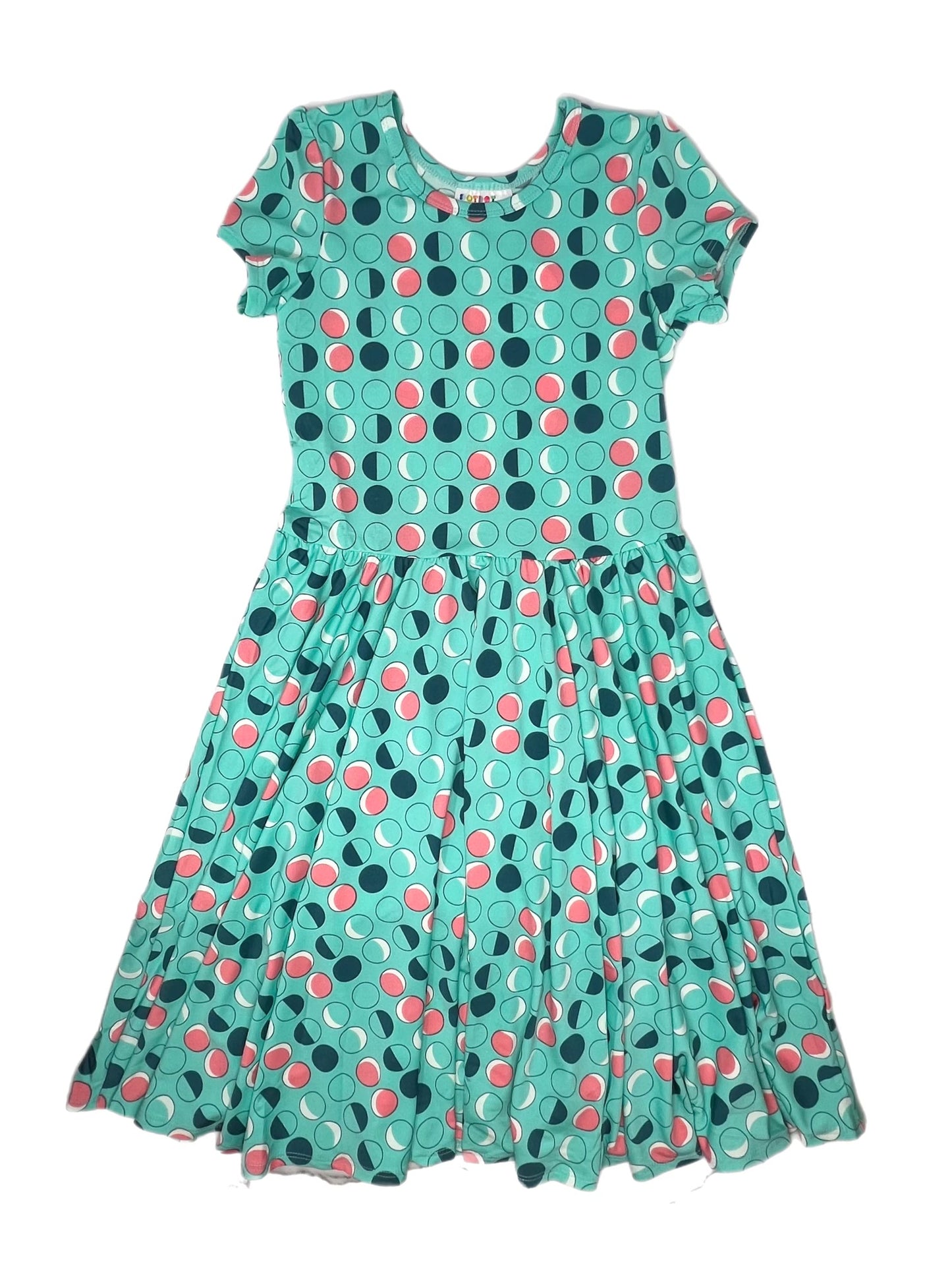 Celebrate the beauty of the night sky with the Lunar Love Cap Dress! This enchanting dress features a mesmerizing pattern of moon phases in soothing teal, coral, and navy tones, perfect for little stargazers and dreamers. The classic cap sleeve design and twirl-worthy skirt make it a must-have for playdates, special outings, or simply spinning under the stars.