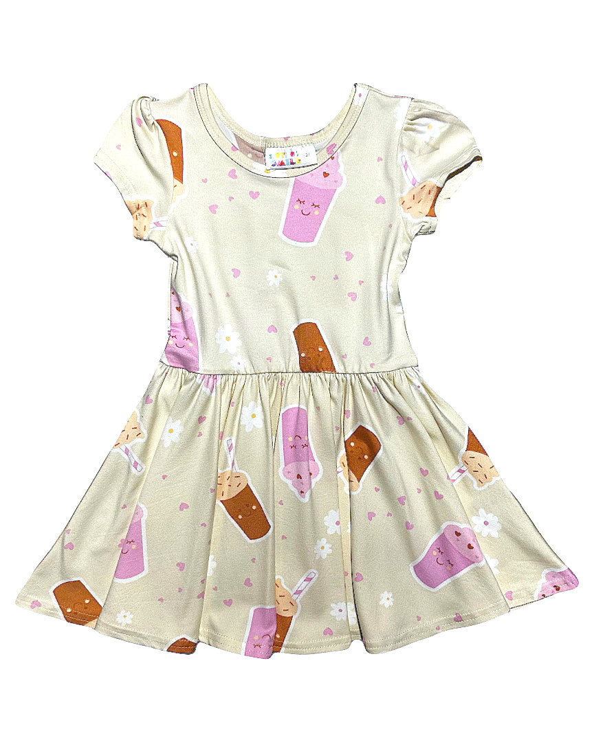 Sip, smile, and twirl in the Sippin Sweet Cap Dress! This adorable dress features a delightful print of happy bubble tea cups, iced coffees, and sweet treats, making it a must-have for little ones who love all things cute and cozy. The soft pastel tones and playful design bring a fun, whimsical feel, perfect for any adventure—whether it's a playdate, a trip to the café, or a day of twirling fun.